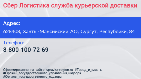 Сбер Логистика, служба курьерской доставки по адресу 628408, Ханты-Мансийский АО, Сургут, Республики, 84 в дальнейшем Организация, размещена в следующих категориях: