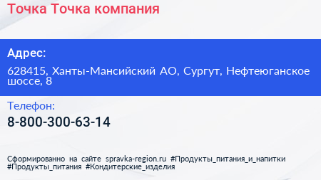 Точка-Точка, компания по адресу 628415, Ханты-Мансийский АО, Сургут, Нефтеюганское шоссе, 8 в дальнейшем Организация, размещена в следующих категориях: