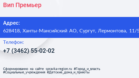 Вип Премьер по адресу 628418, Ханты-Мансийский АО, Сургут, Лермонтова, 11/5 в дальнейшем Организация, размещена в следующих категориях: