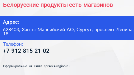 Белорусские продукты, сеть магазинов по адресу 628403, Ханты-Мансийский АО, Сургут, проспект Ленина, 18 в дальнейшем Организация, размещена в следующих категориях: