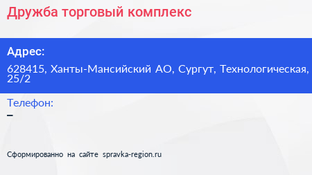 Дружба, торговый комплекс по адресу 628415, Ханты-Мансийский АО, Сургут, Технологическая, 25/2 в дальнейшем Организация, размещена в следующих категориях: