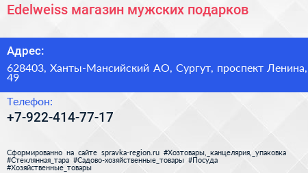 Edelweiss, магазин мужских подарков по адресу 628403, Ханты-Мансийский АО, Сургут, проспект Ленина, 49 в дальнейшем Организация, размещена в следующих категориях: