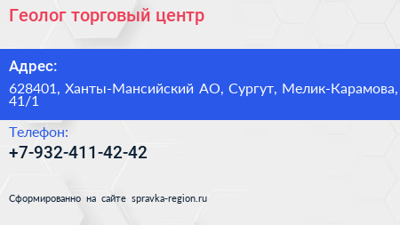 Геолог, торговый центр по адресу 628401, Ханты-Мансийский АО, Сургут, Мелик-Карамова, 41/1 в дальнейшем Организация, размещена в следующих категориях: