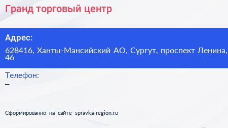 Гранд, торговый центр по адресу 628416, Ханты-Мансийский АО, Сургут, проспект Ленина, 46 в дальнейшем Организация, размещена в следующих категориях: