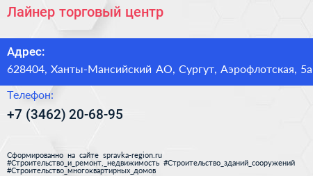 Лайнер, торговый центр по адресу 628404, Ханты-Мансийский АО, Сургут, Аэрофлотская, 5а в дальнейшем Организация, размещена в следующих категориях: