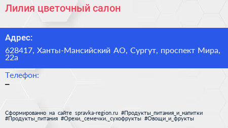 Лилия, цветочный салон по адресу 628417, Ханты-Мансийский АО, Сургут, проспект Мира, 22а в дальнейшем Организация, размещена в следующих категориях: