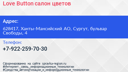 Love Button, салон цветов по адресу 628417, Ханты-Мансийский АО, Сургут, бульвар Свободы, 4 в дальнейшем Организация, размещена в следующих категориях: