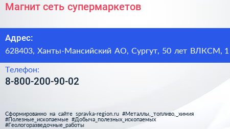 Магнит, сеть супермаркетов по адресу 628403, Ханты-Мансийский АО, Сургут, 50 лет ВЛКСМ, 1 в дальнейшем Организация, размещена в следующих категориях: