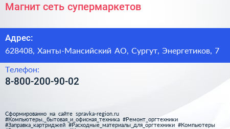 Магнит, сеть супермаркетов по адресу 628408, Ханты-Мансийский АО, Сургут, Энергетиков, 7 в дальнейшем Организация, размещена в следующих категориях: