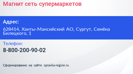 Магнит, сеть супермаркетов по адресу 628414, Ханты-Мансийский АО, Сургут, Семёна Билецкого, 1 в дальнейшем Организация, размещена в следующих категориях: