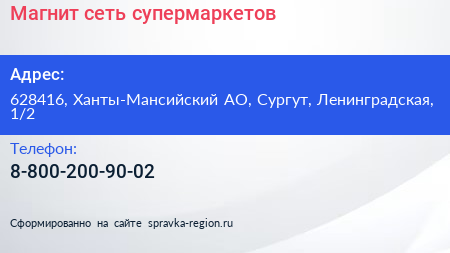 Магнит, сеть супермаркетов по адресу 628416, Ханты-Мансийский АО, Сургут, Ленинградская, 1/2 в дальнейшем Организация, размещена в следующих категориях: