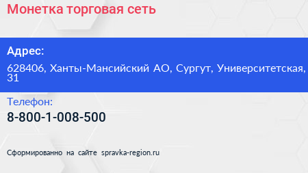 Монетка, торговая сеть по адресу 628406, Ханты-Мансийский АО, Сургут, Университетская, 31 в дальнейшем Организация, размещена в следующих категориях: