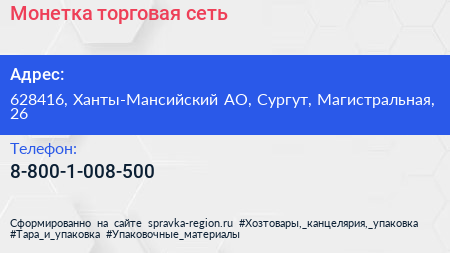 Монетка, торговая сеть по адресу 628416, Ханты-Мансийский АО, Сургут, Магистральная, 26 в дальнейшем Организация, размещена в следующих категориях: