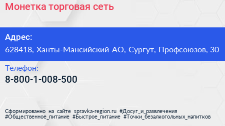 Монетка, торговая сеть по адресу 628418, Ханты-Мансийский АО, Сургут, Профсоюзов, 30 в дальнейшем Организация, размещена в следующих категориях: