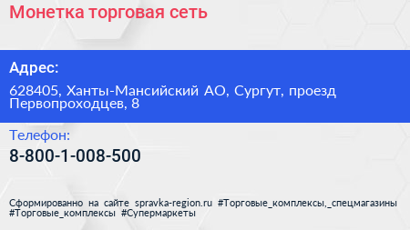 Монетка, торговая сеть по адресу 628405, Ханты-Мансийский АО, Сургут, проезд Первопроходцев, 8 в дальнейшем Организация, размещена в следующих категориях: