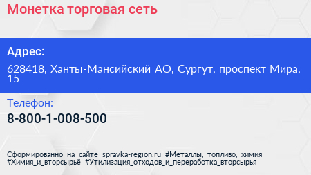 Монетка, торговая сеть по адресу 628418, Ханты-Мансийский АО, Сургут, проспект Мира, 15 в дальнейшем Организация, размещена в следующих категориях: