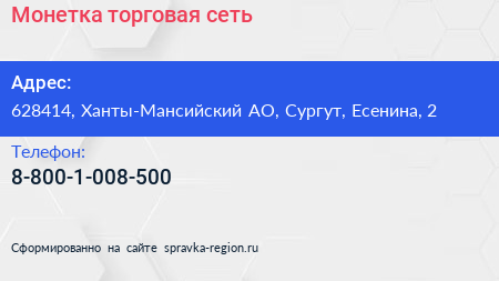 Монетка, торговая сеть по адресу 628414, Ханты-Мансийский АО, Сургут, Есенина, 2 в дальнейшем Организация, размещена в следующих категориях:
