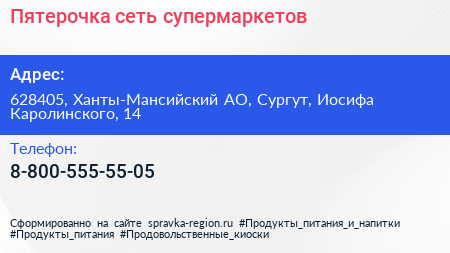 Пятерочка, сеть супермаркетов по адресу 628405, Ханты-Мансийский АО, Сургут, Иосифа Каролинского, 14 в дальнейшем Организация, размещена в следующих категориях: