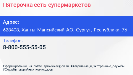 Пятерочка, сеть супермаркетов по адресу 628408, Ханты-Мансийский АО, Сургут, Республики, 76 в дальнейшем Организация, размещена в следующих категориях:
