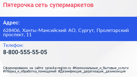 Пятерочка, сеть супермаркетов по адресу 628406, Ханты-Мансийский АО, Сургут, Пролетарский проспект, 11 в дальнейшем Организация, размещена в следующих категориях: