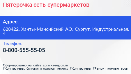 Пятерочка, сеть супермаркетов по адресу 628422, Ханты-Мансийский АО, Сургут, Индустриальная, 4 в дальнейшем Организация, размещена в следующих категориях: