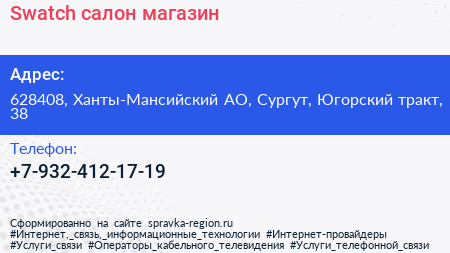 Swatch, салон-магазин по адресу 628408, Ханты-Мансийский АО, Сургут, Югорский тракт, 38 в дальнейшем Организация, размещена в следующих категориях: