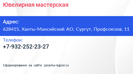 Ювелирная мастерская по адресу 628415, Ханты-Мансийский АО, Сургут, Профсоюзов, 11 в дальнейшем Организация, размещена в следующих категориях: