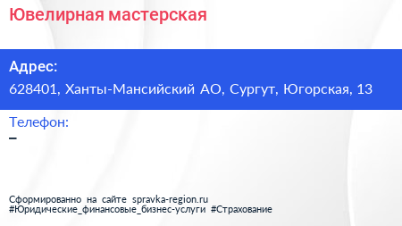 Ювелирная мастерская по адресу 628401, Ханты-Мансийский АО, Сургут, Югорская, 13 в дальнейшем Организация, размещена в следующих категориях: