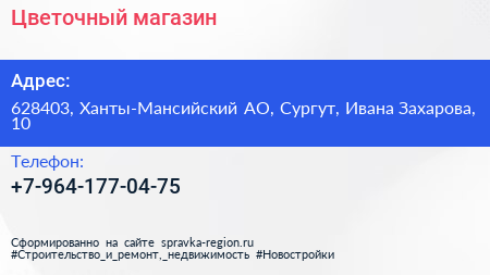 Цветочный магазин по адресу 628403, Ханты-Мансийский АО, Сургут, Ивана Захарова, 10 в дальнейшем Организация, размещена в следующих категориях: