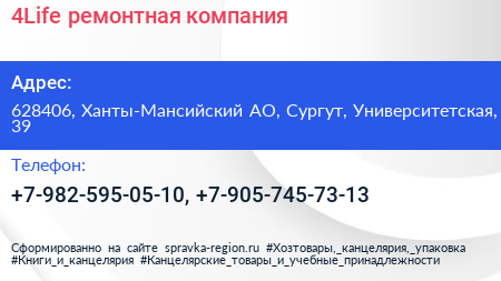 4Life, ремонтная компания по адресу 628406, Ханты-Мансийский АО, Сургут, Университетская, 39 в дальнейшем Организация, размещена в следующих категориях: