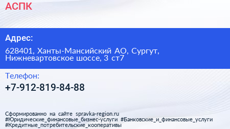 АСПК по адресу 628401, Ханты-Мансийский АО, Сургут, Нижневартовское шоссе, 3 ст7 в дальнейшем Организация, размещена в следующих категориях: