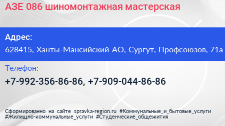АЗЕ 086, шиномонтажная мастерская по адресу 628415, Ханты-Мансийский АО, Сургут, Профсоюзов, 71а в дальнейшем Организация, размещена в следующих категориях: