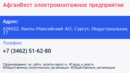 АфганВест, электромонтажное предприятие по адресу 628422, Ханты-Мансийский АО, Сургут, Индустриальная, 17 в дальнейшем Организация, размещена в следующих категориях: