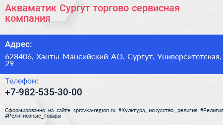 Акваматик-Сургут, торгово-сервисная компания по адресу 628406, Ханты-Мансийский АО, Сургут, Университетская, 29 в дальнейшем Организация, размещена в следующих категориях: