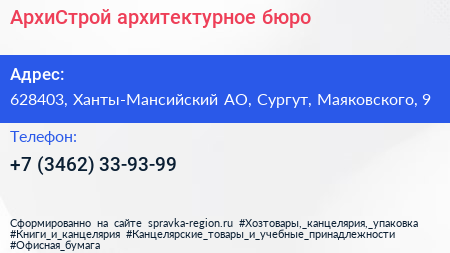 АрхиСтрой, архитектурное бюро по адресу 628403, Ханты-Мансийский АО, Сургут, Маяковского, 9 в дальнейшем Организация, размещена в следующих категориях: