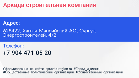 Аркада, строительная компания по адресу 628422, Ханты-Мансийский АО, Сургут, Энергостроителей, 4/2 в дальнейшем Организация, размещена в следующих категориях:
