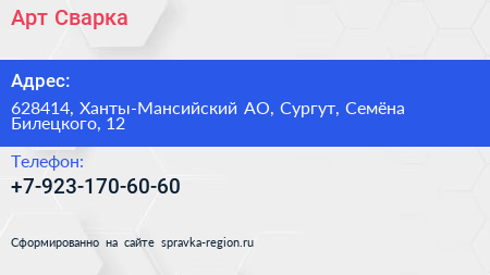 Арт Сварка по адресу 628414, Ханты-Мансийский АО, Сургут, Семёна Билецкого, 12 в дальнейшем Организация, размещена в следующих категориях: