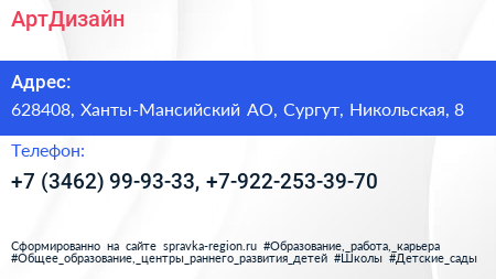 АртДизайн по адресу 628408, Ханты-Мансийский АО, Сургут, Никольская, 8 в дальнейшем Организация, размещена в следующих категориях: