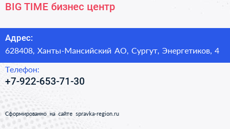 BIG TIME, бизнес-центр по адресу 628408, Ханты-Мансийский АО, Сургут, Энергетиков, 4 в дальнейшем Организация, размещена в следующих категориях: