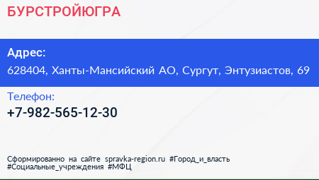 БУРСТРОЙЮГРА по адресу 628404, Ханты-Мансийский АО, Сургут, Энтузиастов, 69 в дальнейшем Организация, размещена в следующих категориях:
