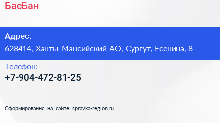 БасБан по адресу 628414, Ханты-Мансийский АО, Сургут, Есенина, 8 в дальнейшем Организация, размещена в следующих категориях: