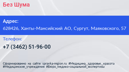 Без Шума по адресу 628426, Ханты-Мансийский АО, Сургут, Маяковского, 57 в дальнейшем Организация, размещена в следующих категориях: