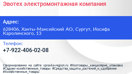 Эвотех, электромонтажная компания по адресу 628406, Ханты-Мансийский АО, Сургут, Иосифа Каролинского, 13 в дальнейшем Организация, размещена в следующих категориях: