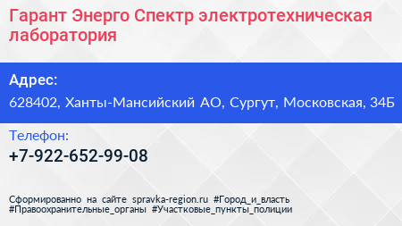 Гарант Энерго Спектр, электротехническая лаборатория по адресу 628402, Ханты-Мансийский АО, Сургут, Московская, 34Б в дальнейшем Организация, размещена в следующих категориях: