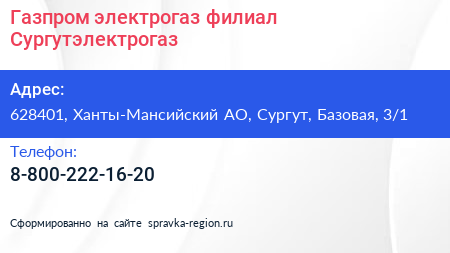 Газпром электрогаз, филиал Сургутэлектрогаз по адресу 628401, Ханты-Мансийский АО, Сургут, Базовая, 3/1 в дальнейшем Организация, размещена в следующих категориях: