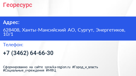 Георесурс по адресу 628408, Ханты-Мансийский АО, Сургут, Энергетиков, 10/1 в дальнейшем Организация, размещена в следующих категориях: