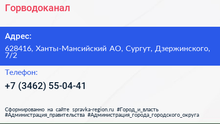 Горводоканал по адресу 628416, Ханты-Мансийский АО, Сургут, Дзержинского, 7/2 в дальнейшем Организация, размещена в следующих категориях: