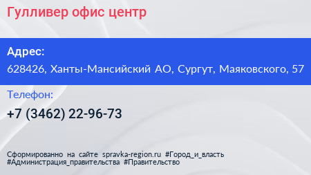 Гулливер, офис-центр по адресу 628426, Ханты-Мансийский АО, Сургут, Маяковского, 57 в дальнейшем Организация, размещена в следующих категориях: