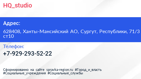 HQ_studio по адресу 628408, Ханты-Мансийский АО, Сургут, Республики, 71/3 ст10 в дальнейшем Организация, размещена в следующих категориях:
