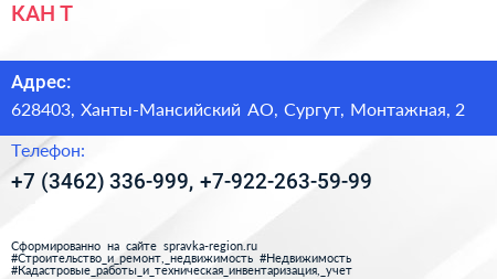 КАН-Т по адресу 628403, Ханты-Мансийский АО, Сургут, Монтажная, 2 в дальнейшем Организация, размещена в следующих категориях:
